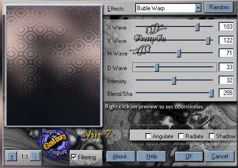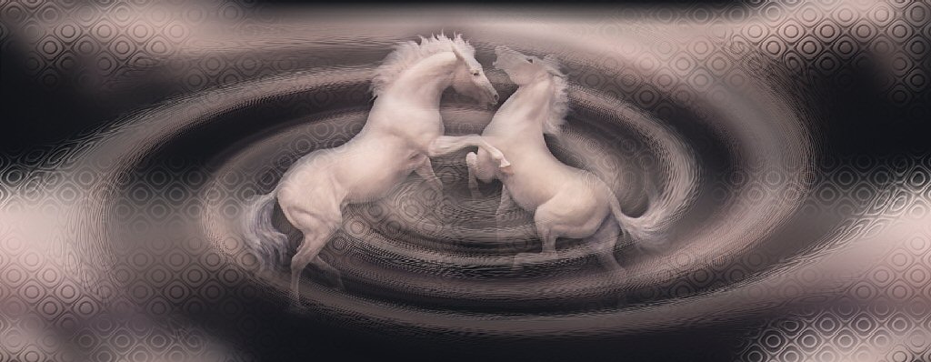 Alors, allons-y!! On commence par ouvrir notre tube, puis fenêtre - dupliquer (2 fois). On ferme l'original. Sur une des 2 copies: Image - Redimentionner 1024 x 400. Calques - nouveau calque raster. On rempli ce calque d'une couleur puisée dans notre tube. Calques - agencer - déplacer vers le bas. Calques - fusionner les calques visibles. Effet d'image - mosaïque sans jointure (angle - bilatérale - 0 - 0 - 50 - linéaire). Effet de flou - flou gaussien à 15. Effet - modules externes - PluginGalaxy - Warp 2: Calque - dupliquer. Effet - distorsion - torsion à 347 Refaire Effet - distorsion - torsion à 347 Calque - basisser l'opacité à 48. Effet - modules externes - FM Tile Tools - BlendEmboss... -1.000 Calque - fusionner les calques visibles. Effet d'image - mosaïque sans jointure (bord - verticale - 19 - 100). Redimenioner le tube si nécessaire. Coller le tube comme un nouveau calque sur votre fond, à gauche. Calque - basisser l'opacité à 88. Ajoutez un calque, signez et fusionnez tout!
