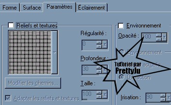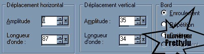 Alors, allons-y!! On commence par ouvrir notre tube, puis fenêtre - dupliquer (2 fois). On ferme l'original. Sur une des 2 copies: Image - Redimentionner 1024 x 380. Calques - nouveau calque raster. On rempli ce calque d'une couleur puisée dans notre tube. Calques - agencer - déplacer vers le bas. Calques - fusionner les calques visibles. Effet de flou - flou gaussien à 15. Effet d'image - mosaïque sans jointure (angle - bilatérale - 0 - 0 - 50 - linéaire). Effet - modules externes - DSB Flux - Linear Transmission (12, 4, 50, horizontal). Effet - modules externes - Simple - Diamonds. Effet d'image - mosaïque sans jointure (angle - bilatérale - 0 - 0 - 50 - linéaire). Effet de Distorsion - Vagues: Calques - nouveau calque raster. On rempli ce calque de la même couleur puisée dans notre tube que tout à l'heure. On baisse l'opacité du calque au goût (moi à 46%) Calques - fusionner les calques visibles. Effet - modules externes - Simple - Quick Tile Effet - modules externes - FM Tile Tools - BlendEmboss... -1.000 Redimenioner le tube si nécessaire. Coller le tube comme un nouveau calque sur votre fond, à gauche. Faire une ombre portée: